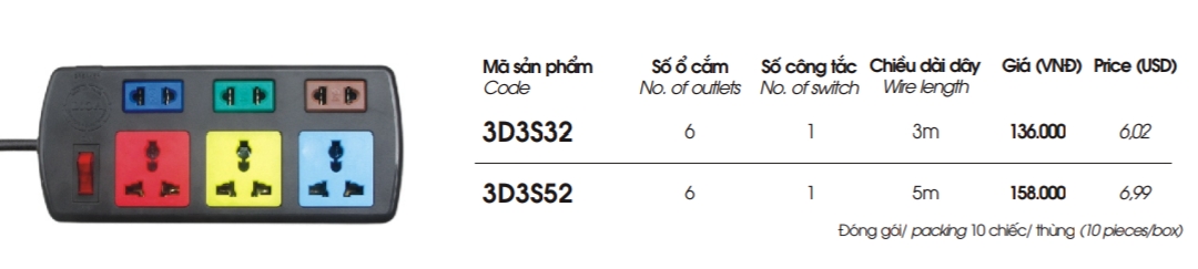 - Số ổ cắm: 03 ổ cắm đa năng + 03 ổ cắm 2 chấu