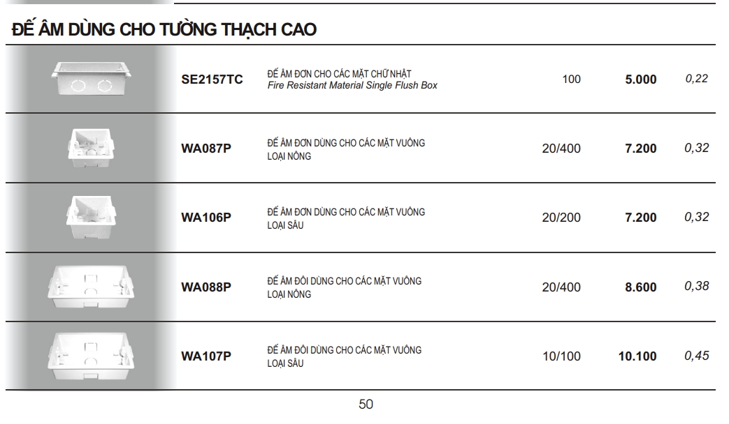 Còn hàngĐế âm lioa dùng cho tường thạch cao gồm đế âm đơn cho mặt hình chữ nhật, đế âm đơn dùng cho mặt âm vuông loại nông - loại sâu, đế âm đôi dùng cho các loại mặt vuông loại nông - loại sâu