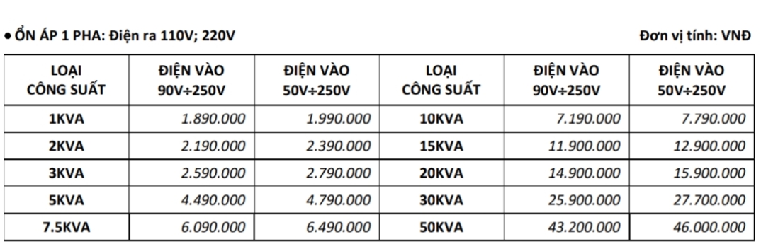- Dưới đây là bảng giá niêm yết ổn áp Ruler 1 pha các loại