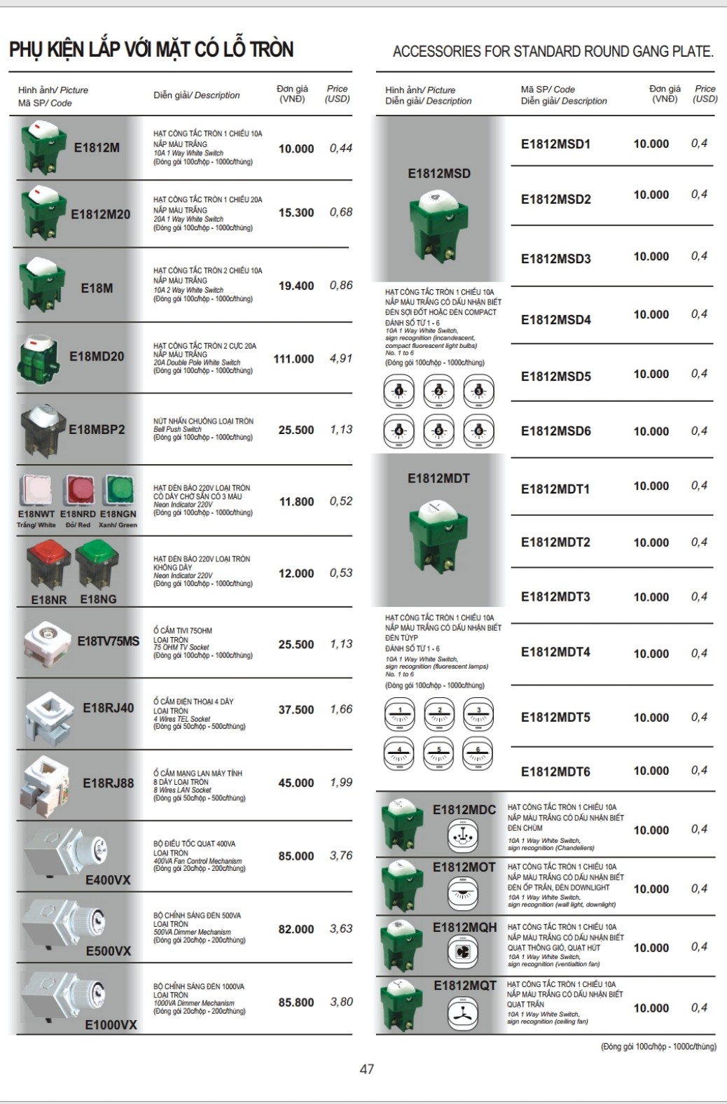 - Dưới đây là bảng giá niêm yết phụ kiện lắp với mặt lỗ tròn các loại
