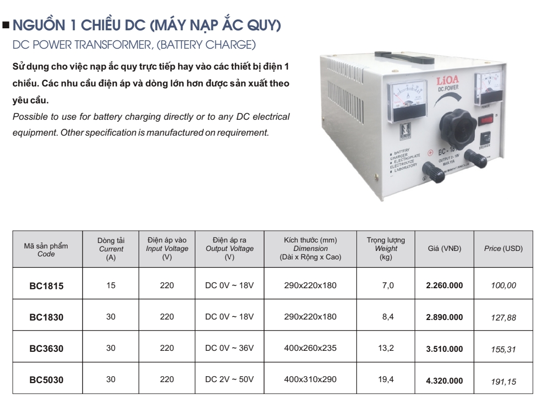 - Nạp ắc quy ô tô của hãng lioa không những dùng cho việc nạp ắc quy mà có thể dùng cho bất cứ thiết bị điện nào sử dụng điện áp 1 chiều phù hợp với công suất máy