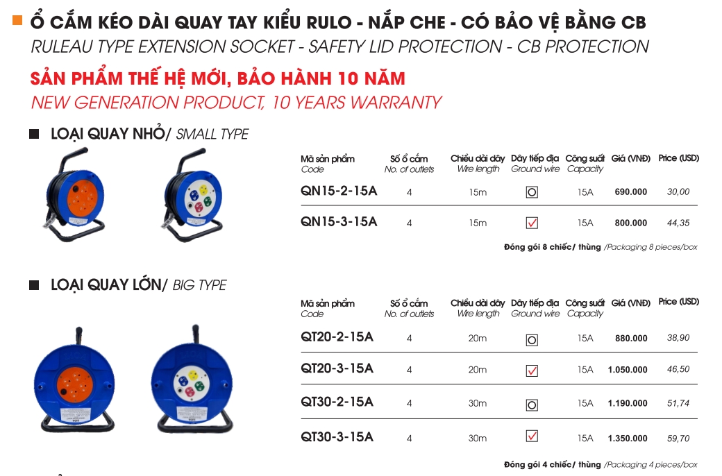 - Ổ cắm rulo 15m thế hệ mới bảo hành 10 năm kể từ năm sản xuất ( Năm sản xuất có nghi trên ổ cắm )