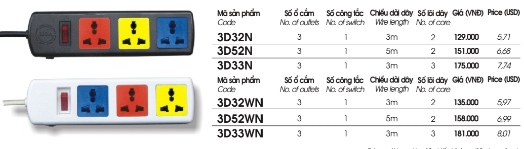 Ổ CẮM LIOA 3 LỖ 5M MÃ SẢN PHẨM 3D52N GIÁ BÁN 130.000VNĐ