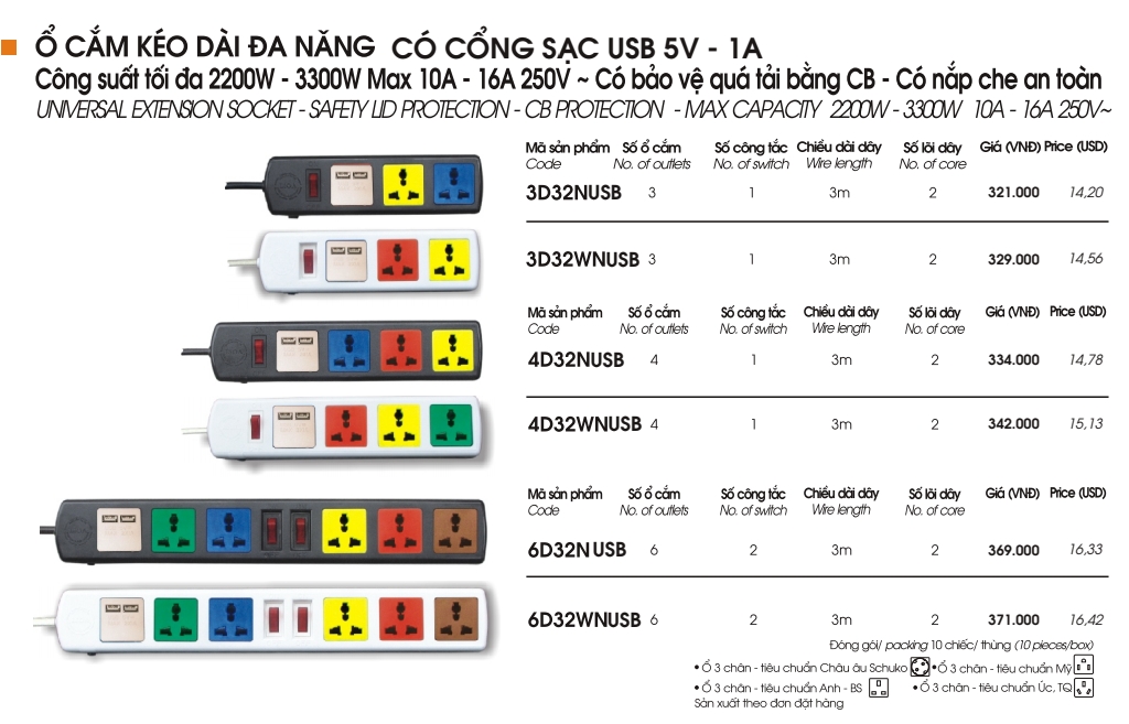 - Mầu sắc: Vỏ ổ cắm màu đen, ổ cắm các loại mầu