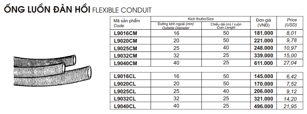 - Dưới đây là bảng giá niêm yết ống luồn đàn hồi lioa các loại