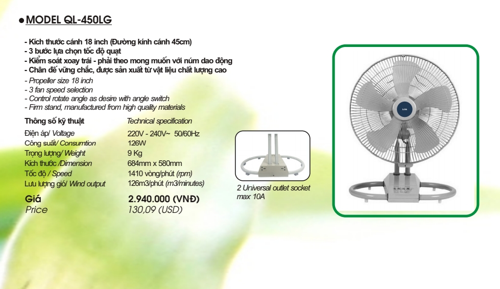 Quạt lioa công nghiệp model QL - 450 được sản xuất trên dây chuyền công nghệ hiện đại nên nhiều gió, chạy êm, tiết kiệm điện, bền vĩnh cửu, không cần bảo dưỡng định kỳ