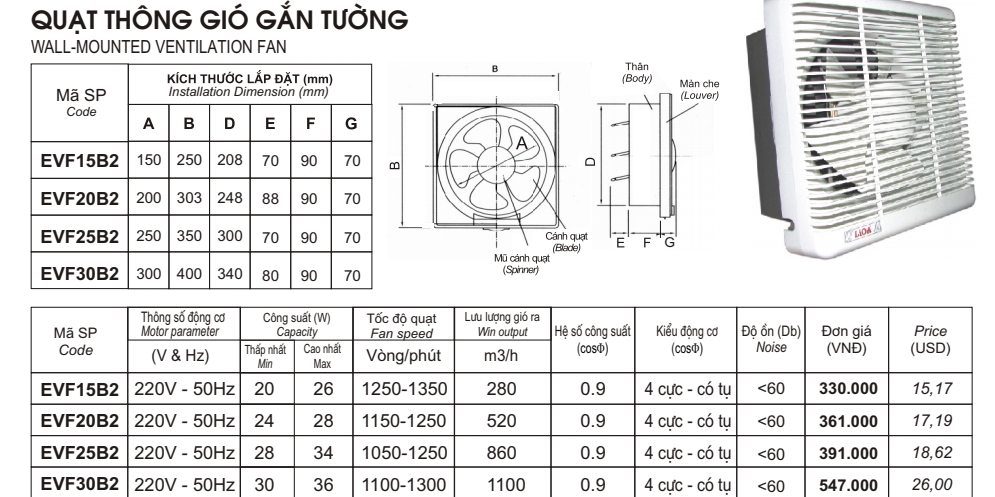 Quạt thông gió lioa EVF15B2 giá bán 330.000VNĐ ( Giá đac bao gồm thuế VAT 10%) |